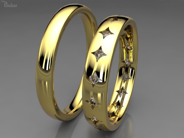 Netypické duo snubních prstenů hned z několika hledisek. Prsten nevěsty je precizně osázen malými kamínky do hvězdicového tvaru a chlubí se také širším rozměrem oproti prstenu ženicha. Bude tak nejen vzácnou vzpomínkou na onen den, ale také exkluzivním šperkem.