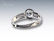 Krásně dominující kámen velkého průměru v objetí ploché korunky zdobí rám prstenu, jehož horní část je rozdělena na dvě menší. Modelu tak dodává nádech moderna.